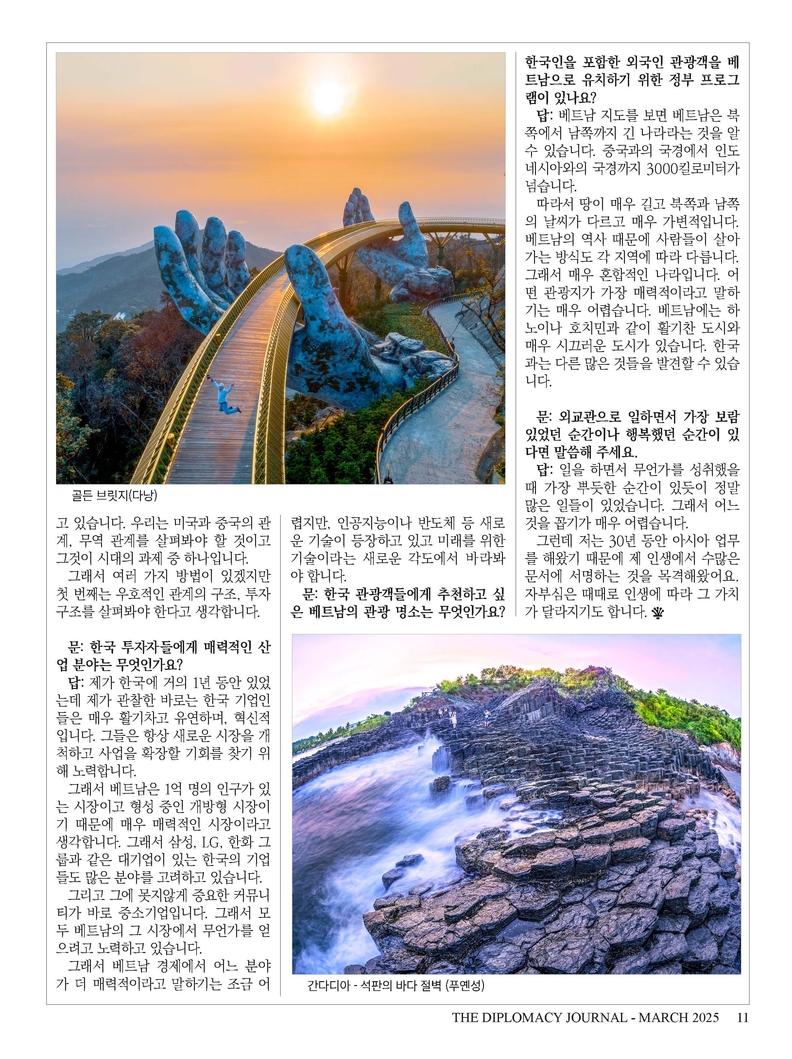 창간 28주년을 맞아 외교저널은 외교 뉴스뿐만 아니라 각국의 문화 교류와 관광지 소개를 더욱 강화할 계획입니다. 문화 교류는 단순한 국가 간 협력을 넘어 국민 간의 이해와 유대감을 형성하는 중요한 요소입니다. 이에 따라 각국의 전통 예술, 음식, 축제, 문화 행사 등을 심층적으로 조명하고, 더 많은 독자들이 세계 여러 나라의 문화를 접할 수 있도록 다양한 콘텐츠를 제공할 예정입니다. 또한 각국의 주요 관광지와 숨겨진 명소를 발굴해 소개함으로써 국제 관광 교류 활성화에도 기여하고자 합니다. 이를 통해 한국인들에게는 해외 여행 정보를 제공하고, 한국을 찾는 외국인들에게는 대한민국의 아름다움을 알리는 콘텐츠를 강화해 나가겠습니다.