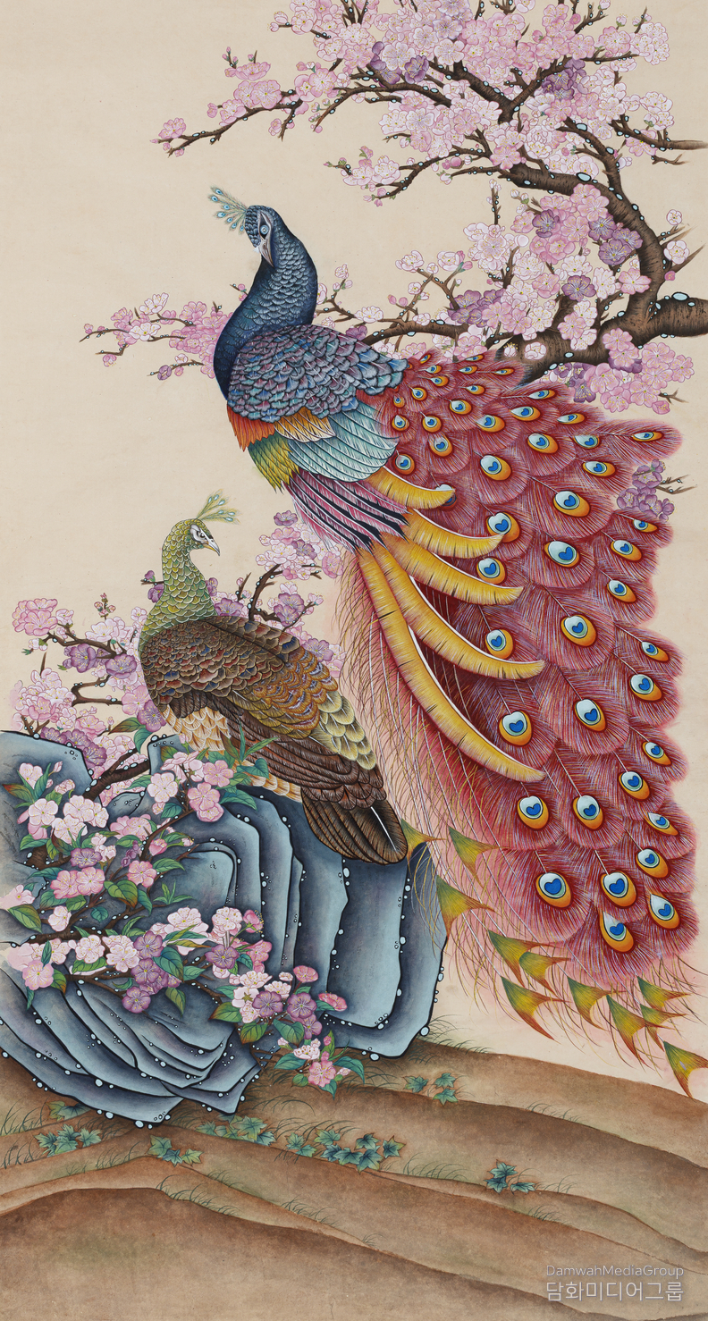 공작의 꼬리깃은 색채의 향연이다. 초록, 홍색, 청색, 황금빛이 질서와 리듬을 이루며 폭발하듯 퍼져나간다. 특히 깃털의 눈(eye) 문양을 섬세한 선묘로 표현한 기량은 민화 기법과 전통 채색화의 절정이 아름답게 결합된 부분이다. 이 화려함은 단순한 ‘색감의 부유함’이 아니라, 삶을 향한 축복과 기원의 메시지가 시각화된 형태이다.