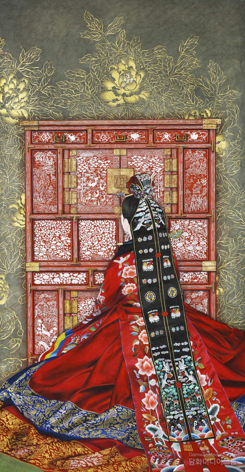 가장 먼저 눈을 사로잡는 것은 붉은 예복의 압도적인 존재감이다. 넓게 퍼지는 치맛자락의 곡선, 그 위를 수놓은 모란·연꽃·봉황 문양은 민화에서 길상과 번영을 상징한다. 조혜선 작가는 전통 문양을 단순히 장식으로 처리하지 않고, 인물의 운명과 내면을 암시하는 상징적 언어로 재해석해냄으로써 작품의 깊이를 더한다.