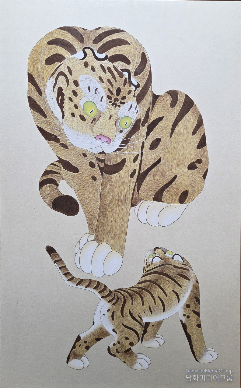 작품 속 큰 호랑이와 아기 호랑이는 권위와 위엄의 표상인 ‘호랑이’가 아닌, 부드럽고 다감한 생명체로 재해석되어 등장한다. 전통 민화에서 자주 보이는 ‘해학적 표정’과 ‘과장된 신체 비례’를 바탕으로 하되, 담화 작가 특유의 섬세한 선묘와 절제된 색감이 더해져 고요하면서도 따뜻한 정서를 자아낸다.