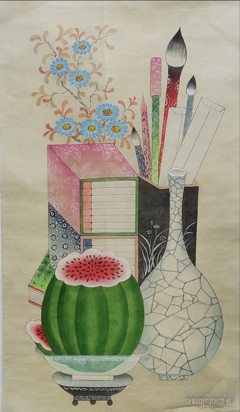 함께 제시된 K-민화 책거리 작품은 전통 민화의 길상적 상징을 오늘의 감각으로 재해석한 결과물이다. 책과 문방구, 붓과 화병, 그리고 화면 전면에 놓인 수박은 단순한 정물이 아니다.