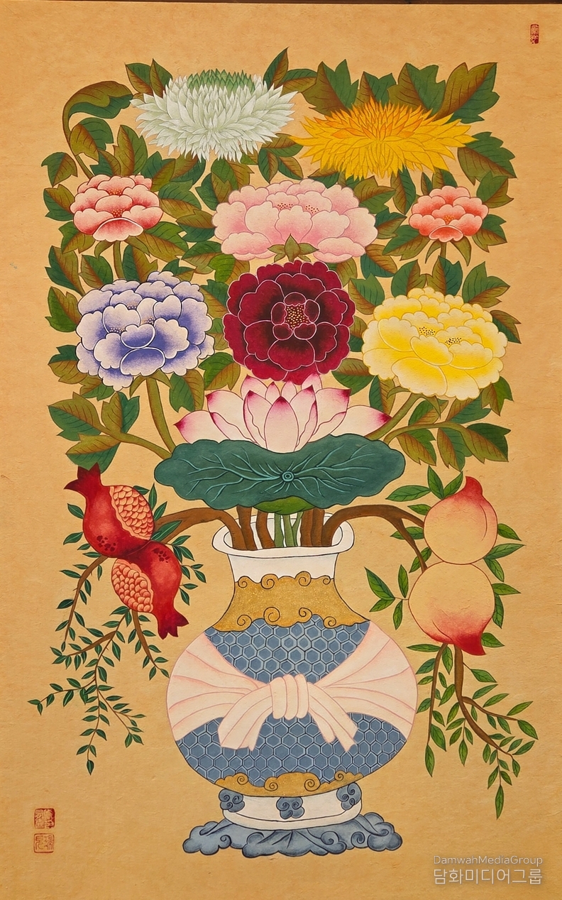 K-컬처 김학영 기자 | 화병도는 ‘꽂는’ 그림이 아니다. 정유희 작가의 '화병도'는 복을 장식처럼 꽂아두는 대신, 삶의 중심에 단단히 묶어두는 방식을 택한다. 작품 중앙의 화병은 끈으로 매여 있고, 그 위로 모란과 국화, 연꽃이 질서 있게 피어난다. 이는 우연한 풍요가 아니라, 관리된 복福의 선언이다.