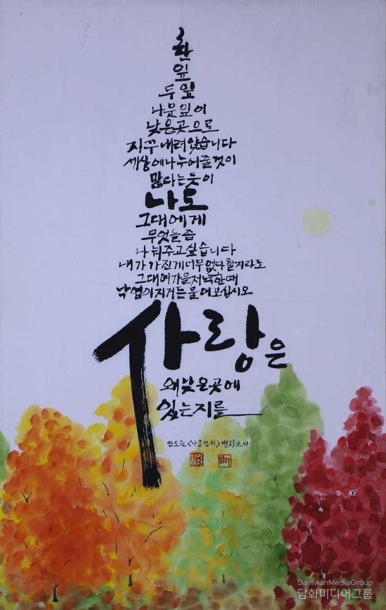 K-컬처 강경희 기자 | 가을은 내려앉는 계절이다. 잎은 위에서 아래로, 마음은 바쁨에서 성찰로 이동한다. 김미자 작가의 K-그라피 작품 ‘안도현의 가을엽서’는 이 ‘내려앉음’을 역설적으로 탑의 형식으로 쌓아 올린다. 시의 행들은 위로 향하지만, 뜻은 낮은 곳을 가리킨다. 그 긴장과 모순이 이 작품의 미학이다.