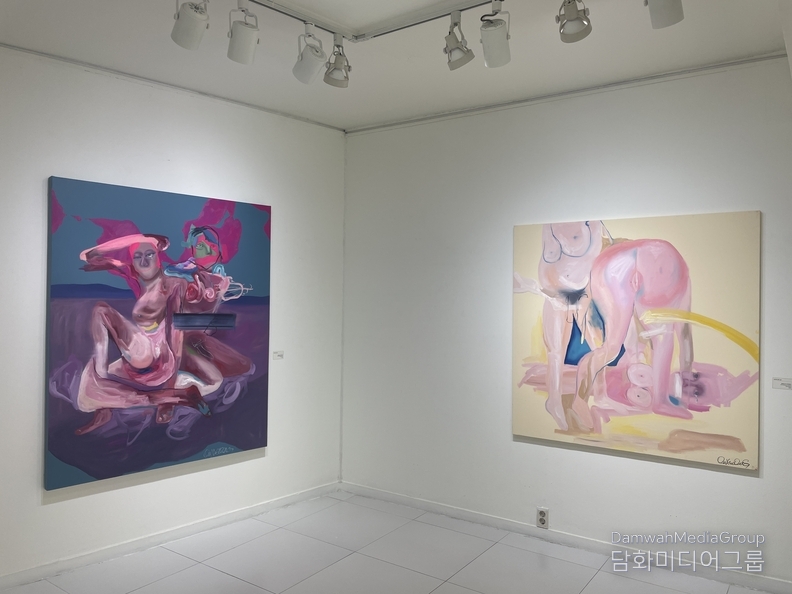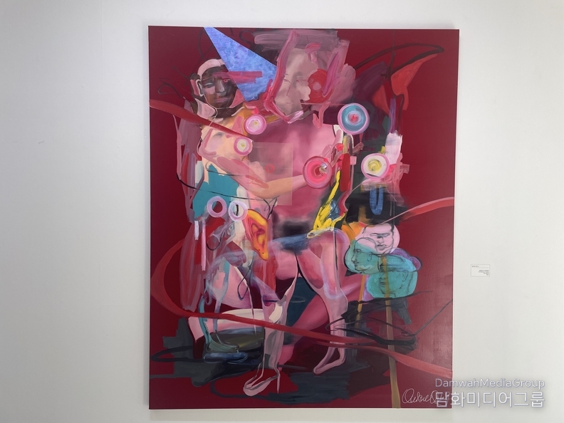 이번 작업에서 가장 중요한 조형 요소는 색채이다. 붉은색과 분홍색을 중심으로 형성된 강렬한 색면은 인체와 공간의 경계를 흐리게 만들며, 신체를 색채 속에서 떠오르고 사라지는 존재처럼 보이게 한다. 형광에 가까운 색채 대비는 화면 전체에 강한 감각적 긴장을 형성하며, 색은 단순한 표현 수단을 넘어 감각의 흐름을 조직하는 구조적 요소로 기능한다. 이러한 색채의 확산은 신체와 공간이 서로 침투하는 불안정한 상태를 만들어내며, 관람자로 하여금 현실과 환상이 교차하는 지각의 층위를 경험하게 한다.