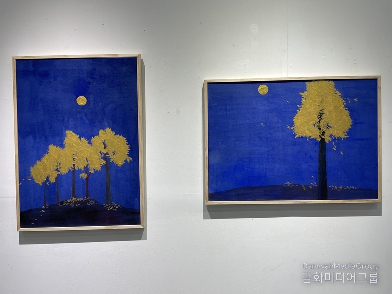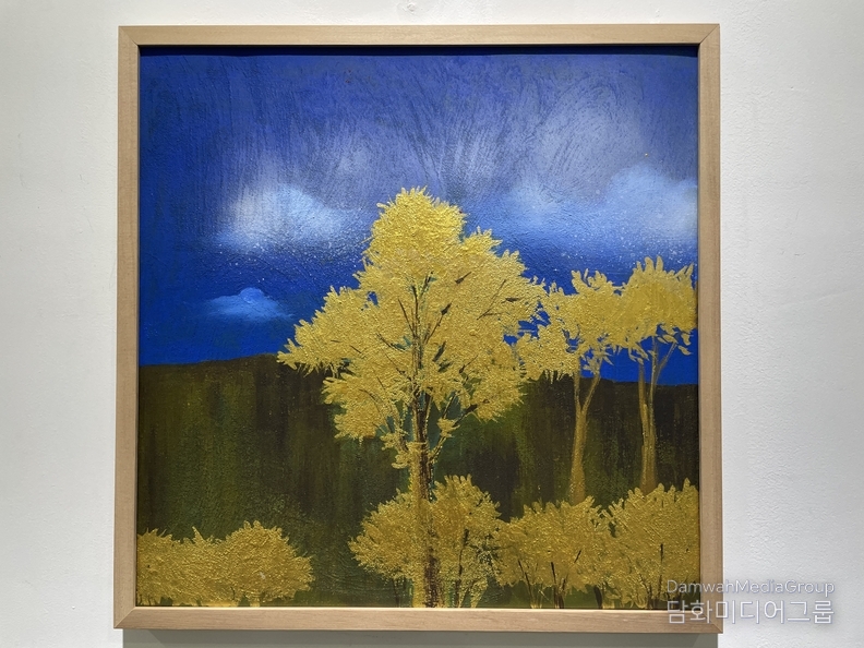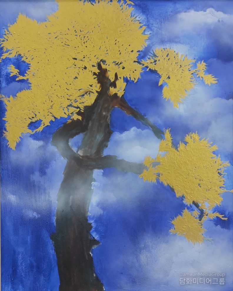 금박(金箔)의 물성을 적극적으로 활용한 작가의 표현은 회화의 평면성을 넘어, 빛과 질감의 조형적 대화를 이끌어낸다. 두껍게 입혀진 금빛 질감은 빛의 각도에 따라 다른 표정을 만들어내며, 이는 자연이 지닌 시간성과 생명 에너지를 은유한다. 화면의 푸른 색면은 단순한 배경이 아니라, 자연과 정신이 교감하는 하늘 혹은 심상의 공간으로 기능한다.