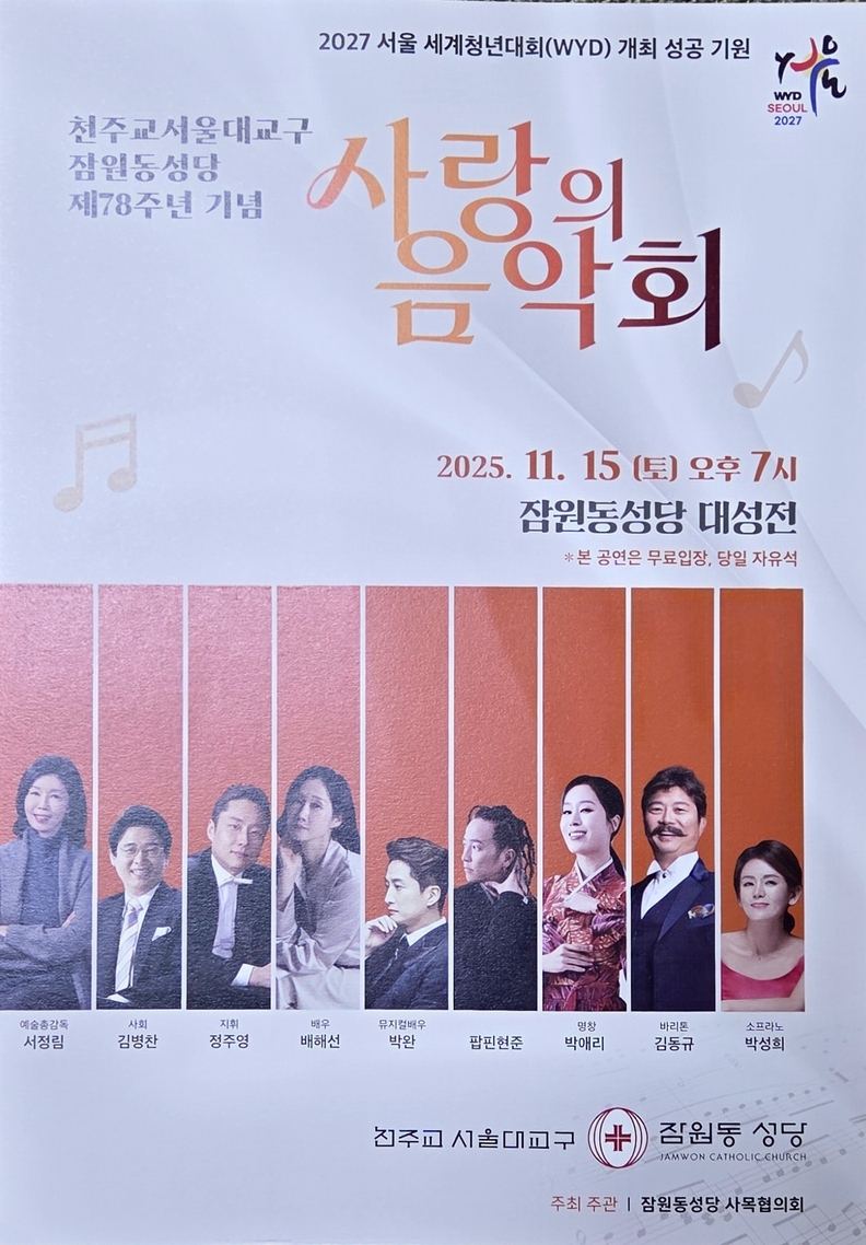 깊어가는 가을밤, 잠원동성당의 ‘사랑의 음악회’는 신앙·예술·공동체가 어우러진 축복의 자리가 될 것이며, 2027년 서울에서 열릴 세계청년대회의 성공을 기원하는 희망의 불빛을 환히 밝히게 될 것이다.