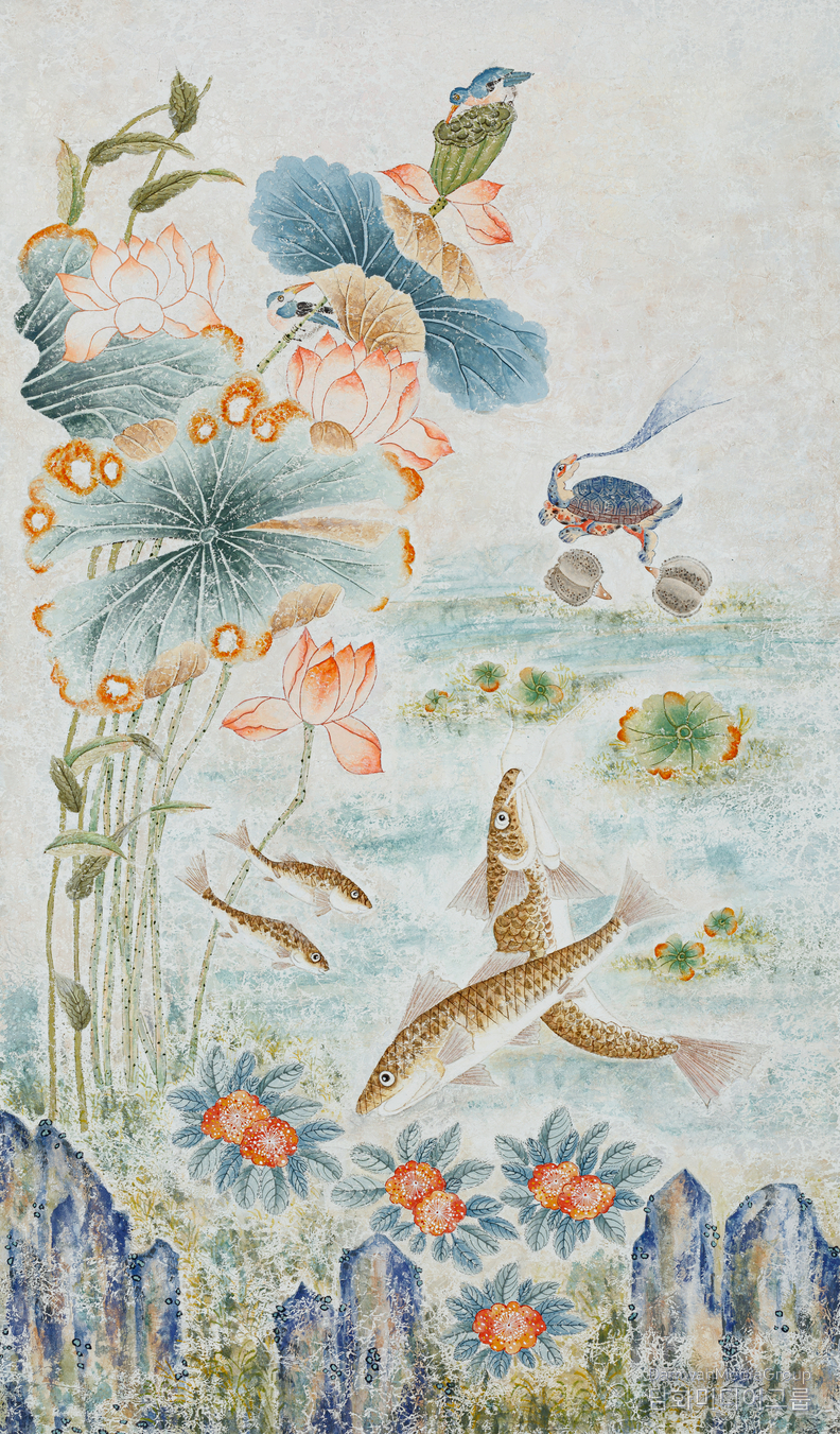 한편, 화면 중앙의 물고기들은 민화에서 가장 강력한 길상문 중 하나인 어魚·복福의 관계를 표현한다. 특히 두 마리의 큰 물고기가 서로 교차하며 오르는 모습은 풍요와 성공, 그리고 ‘입신양명立身揚名’을 상징하는 대표적 도상으로, 관운·승진·입학 등 인생의 큰 경사를 기원하는 의미를 품고 있다. 작가는 물고기의 비늘을 세밀한 필력으로 묘사해 전통 기법의 충실함을 보여주면서도, 밝고 투명한 색감을 사용해 현대적 청량감을 더했다.