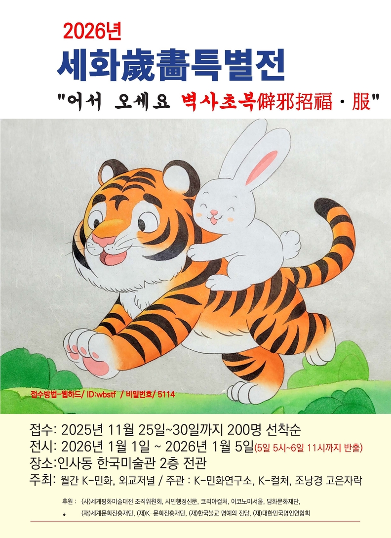 병오년 “어서 오세요 벽사초복”, 새해 첫날 인사동에서 복을 나누다 2026년 새해 첫날, 한국미술관 2층 전관에서 펼쳐질 「세화歲畵 특별전...어서 오세요 벽사초복」은 한국 고유의 민화정신과 국제문화교류를 잇는 세계화 프로젝트의 핵심 축이다.