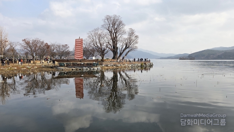 첫 번째 사진 속, 붉은 돛을 단 배는 두물머리의 겨울 풍경을 상징처럼 떠받치고 있다. 나무는 잎을 모두 비워냈지만, 가지마다 깃든 선線은 더 선명해졌다. 수면은 고요해 하늘과 나무를 완벽히 반영하고, 그 위에 정박한 돛배는 마치 긴 시간을 건너온 사신처럼 바람 한 점 없는 겨울에도 묵직한 존재감을 드러낸다. 이 돛배는 실제로 움직이지 않는다.