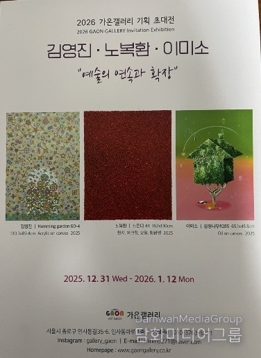 K-컬처 전득준 기자 | 각기 다른 조형 언어와 매체를 통해 구축해 온 예술 세계를 한 자리에 펼쳐 보이며, 개인의 작업 궤적이 어떻게 동시대적 담론으로 확장되는가를 보여주는 ‘예술의 연속과 확장’ 김영진.노복환. 이미소 가온갤러리 기획초대전이 가온갤러리(서울 종로구 인사동길 35-6, 마루아트 1층)에서 1월 12일 까지 열리고 있다.