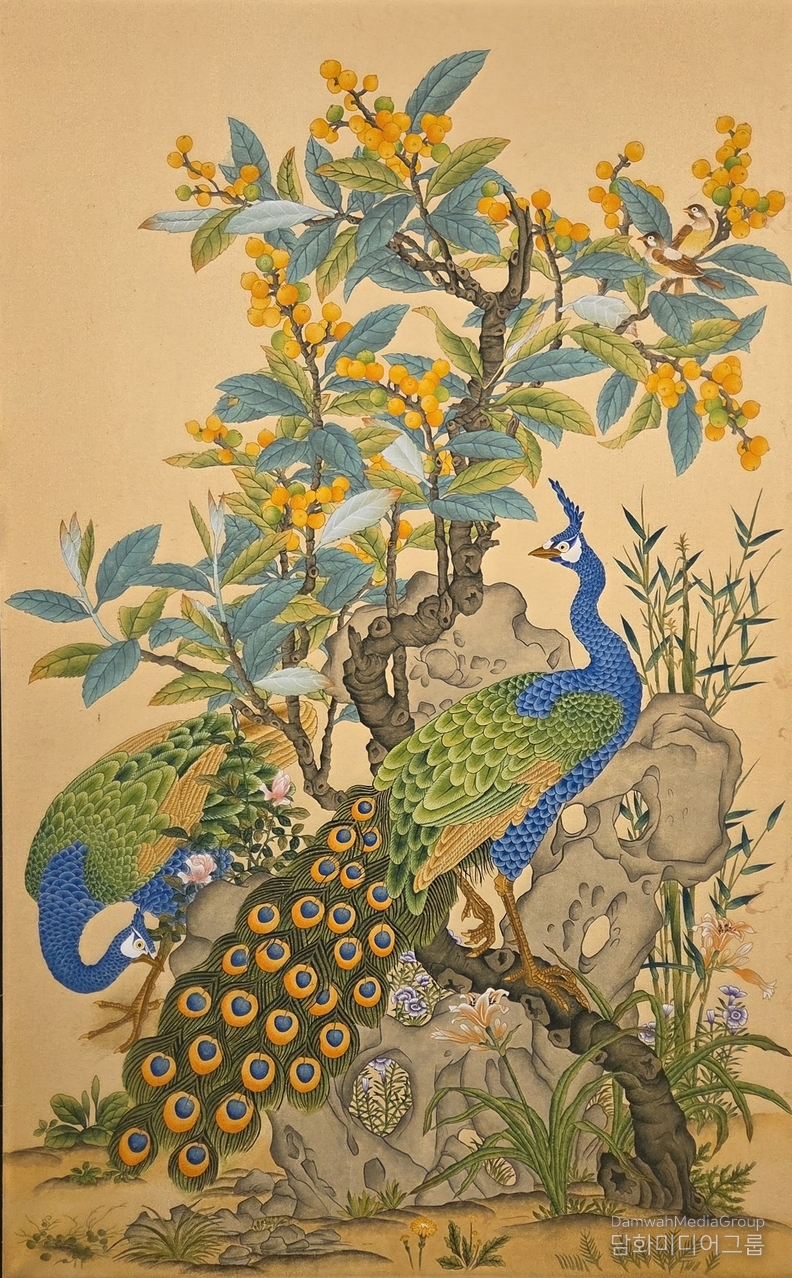 K-컬처 이성준 기자 | k-민화에서 공작은 부귀와 영화의 상징으로 알려져 있다. 그러나 한현숙 작가의 '비파공작'은 이 익숙한 상징을 한 단계 낮은 음역으로 끌어내린다. 이 작품에서 공작은 화려하지만 요란하지 않고, 눈부시지만 스스로를 드러내려 애쓰지 않는다. k-민화가 지켜온 절제의 미학이 이 작품의 화면에서 또렷이 드러난다.