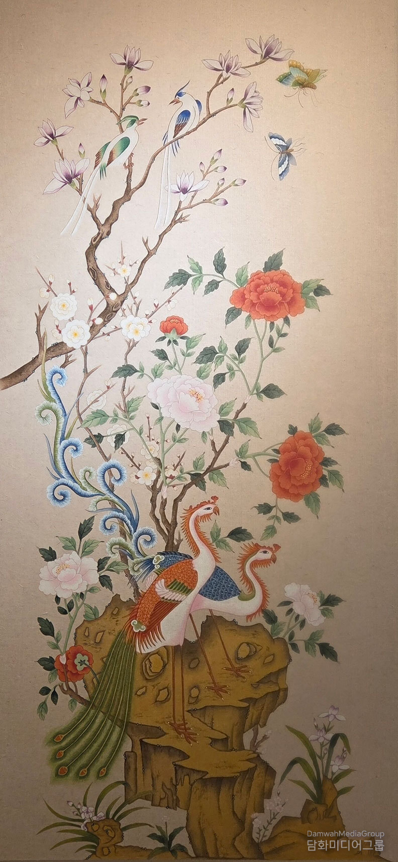 봉황의 깃털은 특히 인상적이다. 녹청과 주홍, 백색과 금빛이 겹겹이 쌓였지만 과장되지 않는다. 이는 기술의 과시가 아니라, 오랜 수행 끝에 도달한 색의 태도다. 색은 서로 경쟁하지 않고, 형태는 질서를 잃지 않는다. k-민화의 본령이 보는 이를 편안하게 하는 힘’이 여기서 또렷이 살아난다.