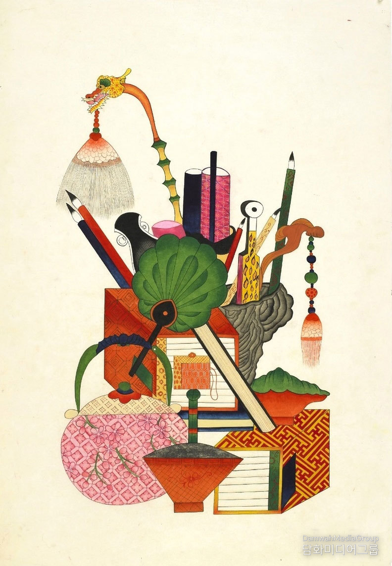 이는 단순한 색의 대비가 아니라, ‘앎이 세상을 밝힌다’는 책거리의 철학을 시각적으로 드러내는 장치로 읽힌다.〈책거리도〉는 과거의 미감만을 되풀이하지 않는다. 오히려 전통의 구조를 기반으로 오늘의 감성과 완성도를 더해 민화가 단순한 향토적 미술이 아니라 동시대 예술의 무대에서도 충분히 경쟁력을 지닌 장르임을 증명한다.