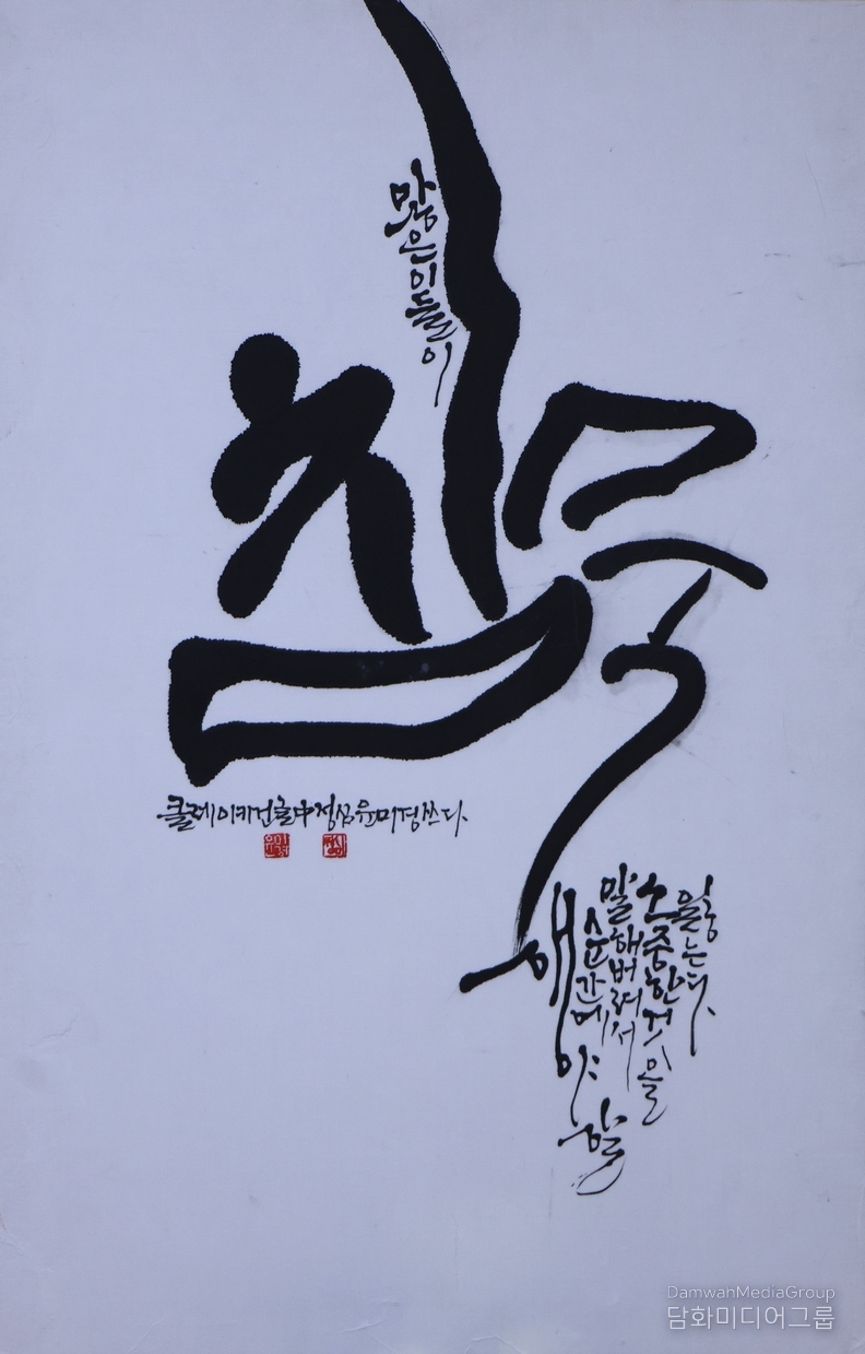 윤미경 작가의 붓은 과감하지만 소란스럽지 않다. 획의 시작과 끝은 분명하되, 여백은 넉넉하다. 이 여백이야말로 작품의 핵심이다. 침묵은 공백이 아니라 보호막이라는 메시지가 여기서 드러난다. 말은 쉽게 흘러나오지만, 침묵은 의식적으로 선택해야 한다는 사실을 작가는 붓의 무게로 증명한다.