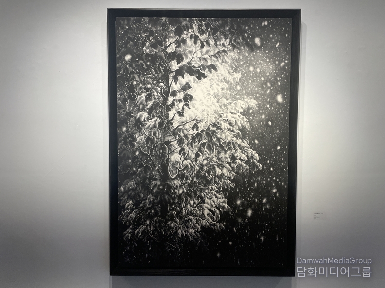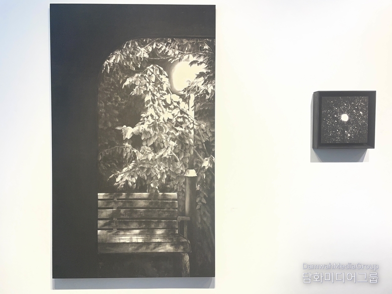 전통적인 수묵화 작품이 화면 전체의 배경색이 흰색인 것에 반하여 작가는 밤 풍경을 화면 안에서 꽉 채워 여백을 시각언어로 전이 시킨 점이다. 전통 수묵화의 기법을 따르면서도, 단순한 재현을 넘어 ‘사유의 미학’으로 확장한 점 역시 시선을 붙잡는다.